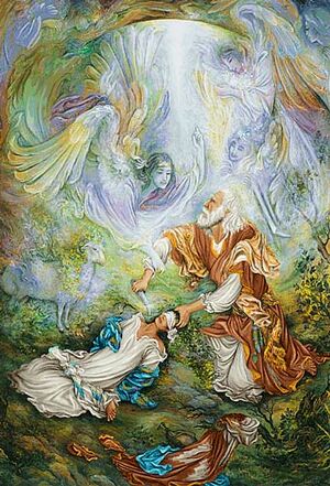 به گزارش قرآن | [[پرونده:اسماعیل (پیامبر).jpg|بندانگشتی|نقاشی استاد فرشچیان از ذبح اسماعیل]] | ||